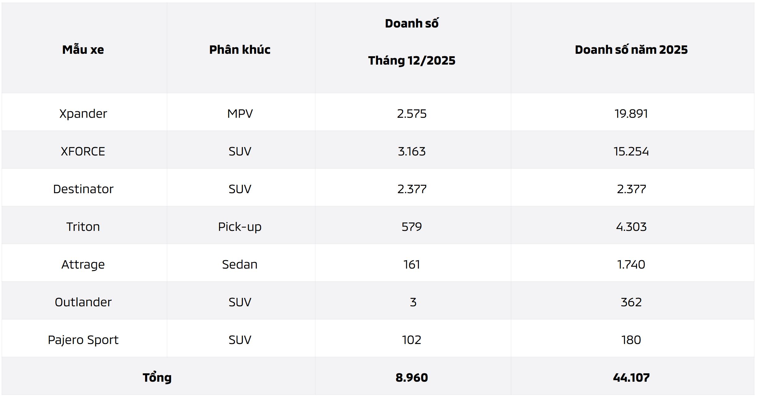 Bên cạnh đó, Xpander và Xforce tiếp tục duy trì phong độ ấn tượng với doanh số tháng 12 lần lượt đạt 2.575 và 3.163 xe, nâng tổng doanh số lũy kế cả năm 2025 lên mốc 19.891 và 15.254 xe. Với kết quả này, cả hai mẫu xe đều kết thúc năm ở vị trí dẫn đầu phân khúc của mình.